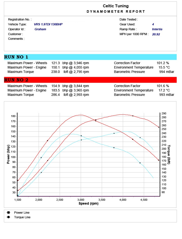 The 1.9 TDi 130bhp utilises a mixture of Honeywell & Garrett Turbo chargers depending on application. All the 130?s are fitted with side mounted intercoolers which provide good performance from the PD engine. We utilise torque limiters in our modified software to ensure the engine speeds reach 2,250rpm before bringing in maximum torque, this ensures a higher lbft torque figure to be achieved whilst maintaining clutch life. The output we set on these engines varies according to vehicle as we tune to ensure clutch life is maintained for standard vehicles. We can achieve figures well over 250bhp with the fitment of uprated turbos and front mounted intercoolers. We develop all of our software on the rolling road to ensure accuracy in terms of both power delivery and also to ensure fuelling, boost pressures and exhaust gas temperatures are all within tolerance. Our aim is for maximum power whilst maintaining optimum reliability.