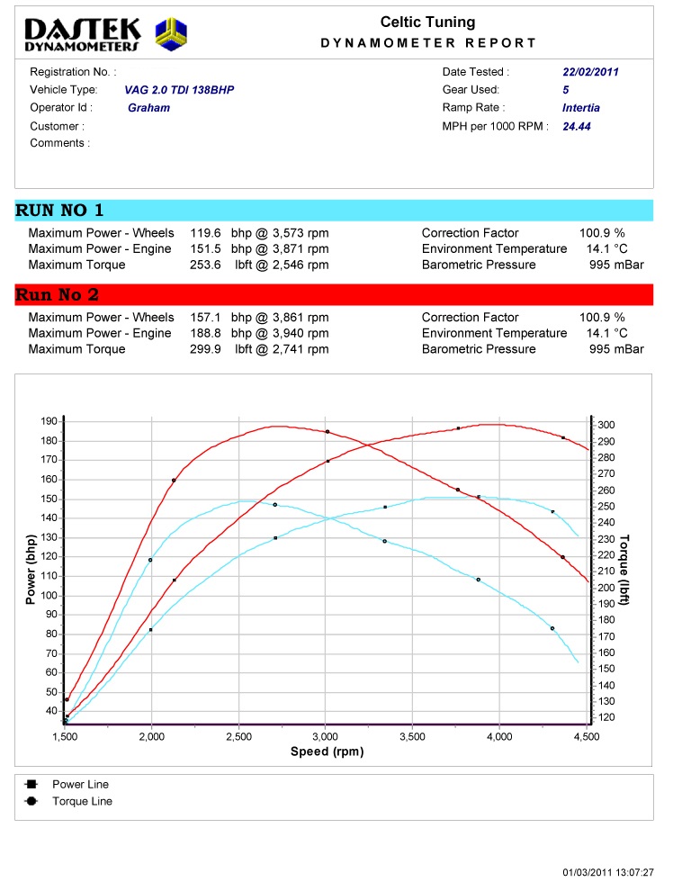 The 2.0 TDi engine supersedes the early 1.9 unit to take power and refinement to the next level. Using VW?s highly acclaimed PD injection system and the latest EDC16 ECU controllers, the stock outputs on these are impressive even as standard. With 2025 bar injection pressure these engines produce high torque at low loads and enable great gains to be had from tuning. The 138bhp (140PS) variant easily achieves 188bhp with little effort. We develop all of our software on the rolling road to ensure accuracy in terms of both power delivery and also to ensure fuelling, boost pressures and exhaust gas temperatures are all within tolerance. Our aim is for maximum power whilst maintaining optimum reliability.