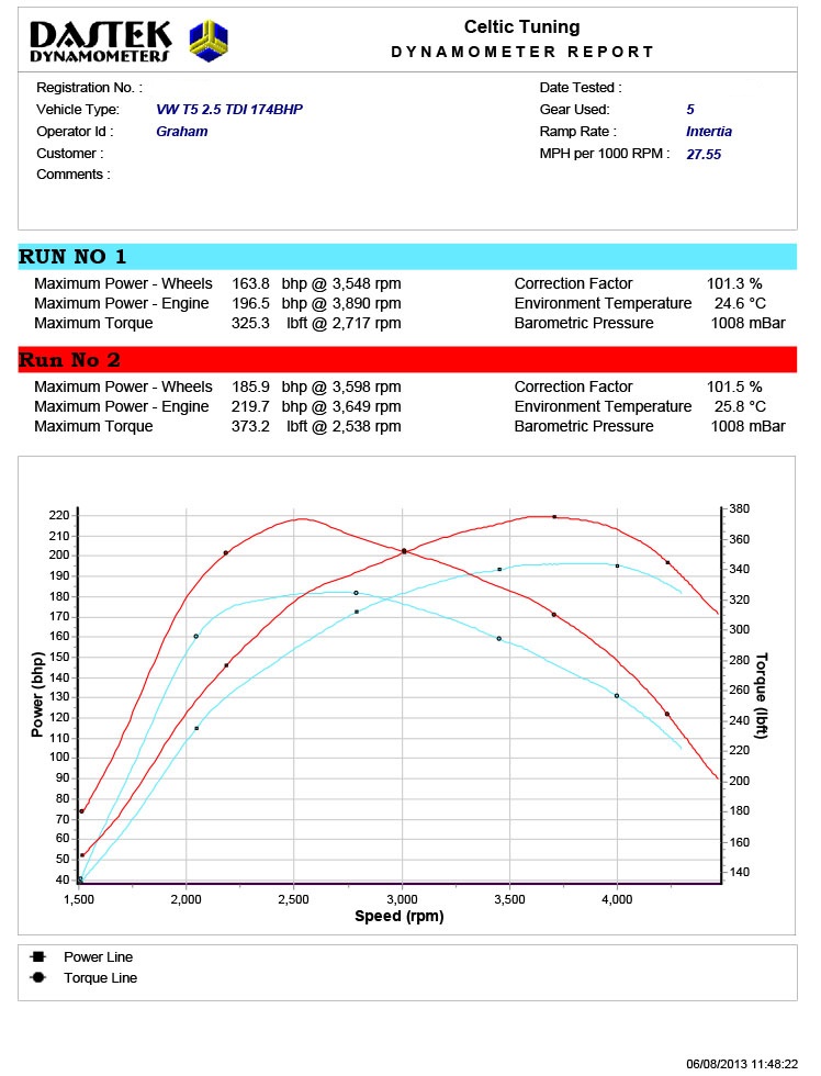 The Transporter T5 2.5 TDi 174bhp variant is the top of the range Transporter. Using a Garrett VNT turbo and front mounted intercooler it provides for some impressive performance even as standard. This engine is exactly half of that used in the Touareg 5.0 V10 so its evident of the tolerances available in this engine. For those who want more we can achieve more power than 228bhp from this engine, likewise we can remove the 120mph speed limiter to make the most of it. We develop all of our software on the rolling road to ensure accuracy in terms of both power delivery and also to ensure fuelling, boost pressures and exhaust gas temperatures are all within tolerance. Our aim is for maximum power whilst maintaining optimum reliability.